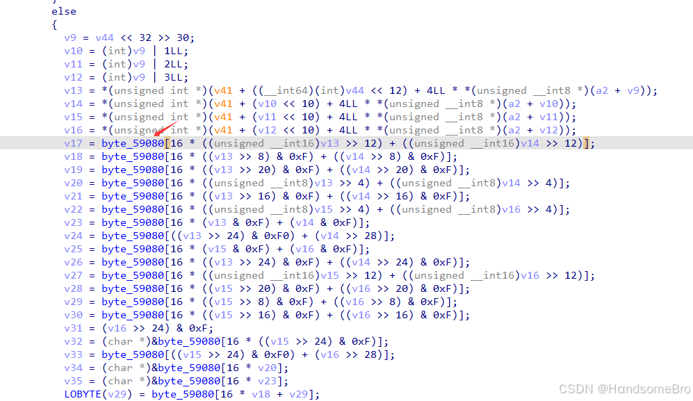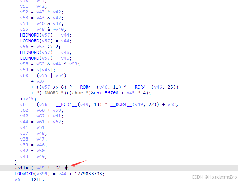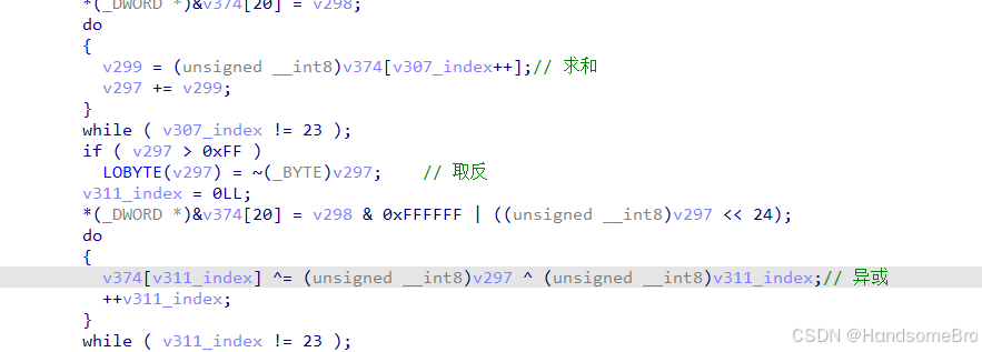 接着往上分析会发现w8是固定值0xd00,w9是求v374前面23个字节之和在取反