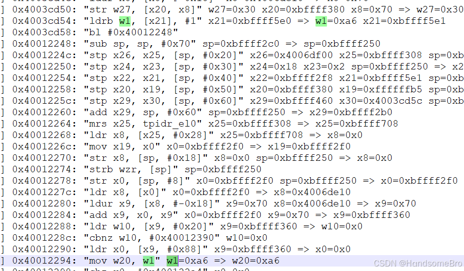 0xac "str w8, [sp, #0x180]" w8=0x676007ac sp=0xbffff470 => w8=0x676007ac ⑥