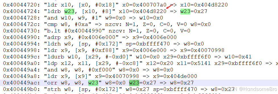 0x27 "strh w8, [sp, #0x172]" w8=0x27 sp=0xbffff470 => w8=0x27 ②
