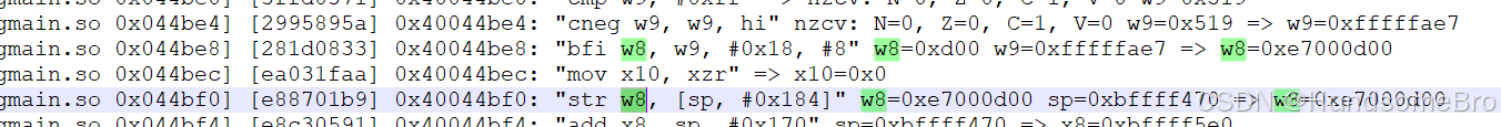 [09:34:01 133][libkwsgmain.so 0x0120f8] [68791f33] 0x400120f8: "bfi w8, w11, #1, #0x1f" w8=0x9823b w11=0x76 => w8=0xed