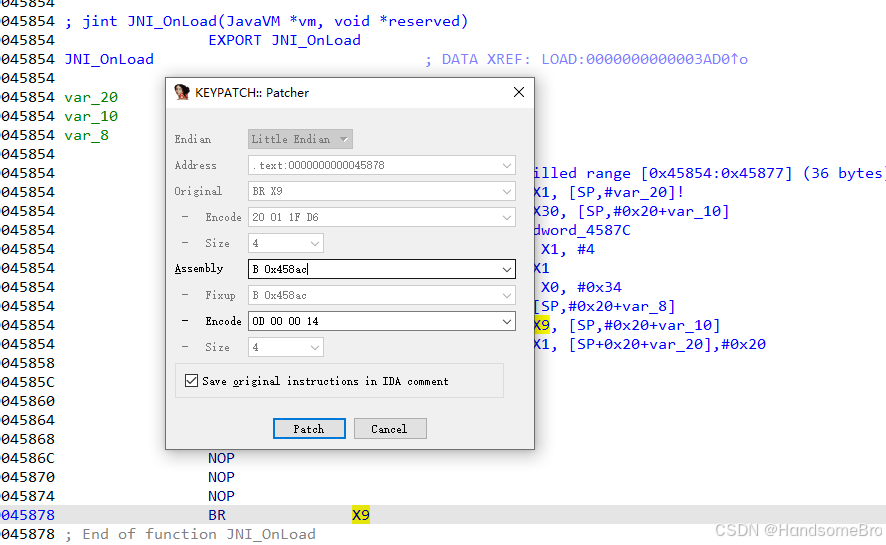 从注释基本都可以看出来,前期开栈到恢复栈,就弄了一堆花里胡哨的算了下绝对跳转地址,x0与x1未变化,也比较符合花指令的特性。只要把前面的垃圾指令nop掉,绝对跳转改成相对跳转即可。