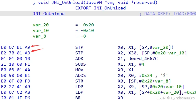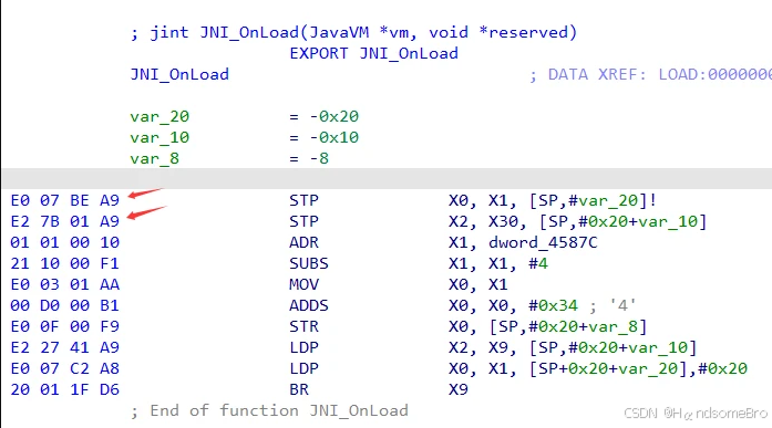 .text:0000000000045854 STP X0, X1, [SP,#-32]! #sp开辟32个字节的空间,x0,x1入栈