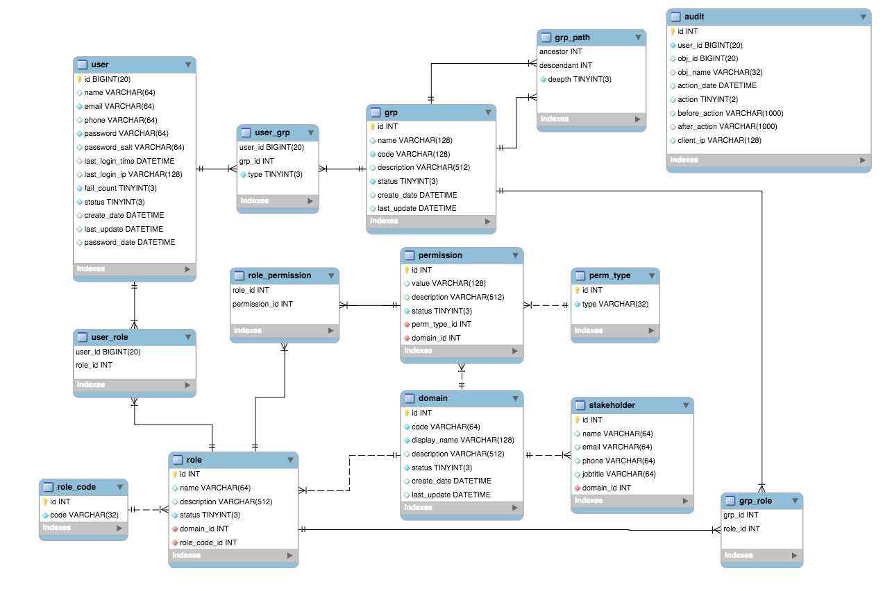 设计的核心主题: 用户、权限、角色、用户角色、角色权限、用户组、用户组角色、操作审计