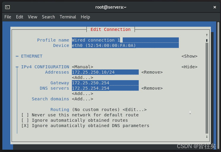 172.25.250.254 ipv4.dns 172.25.254.254 ipv4.method manual connection.autoconnect yes