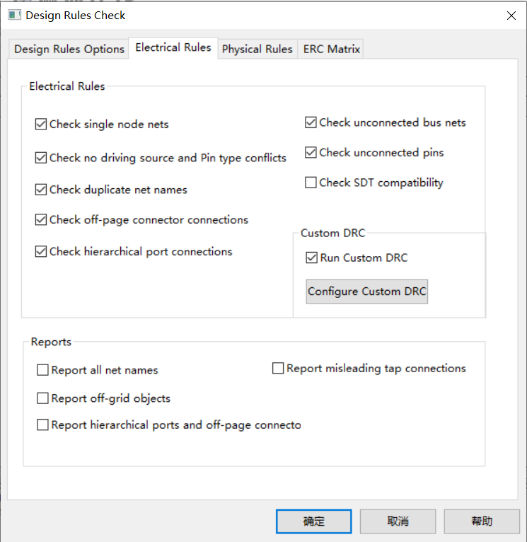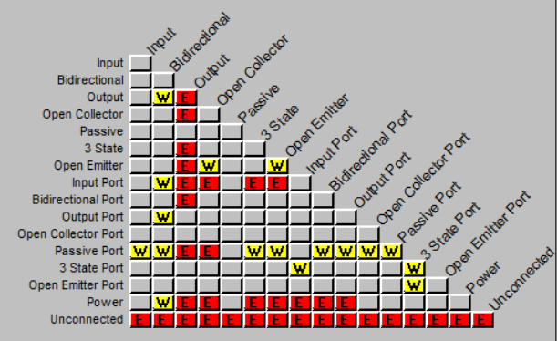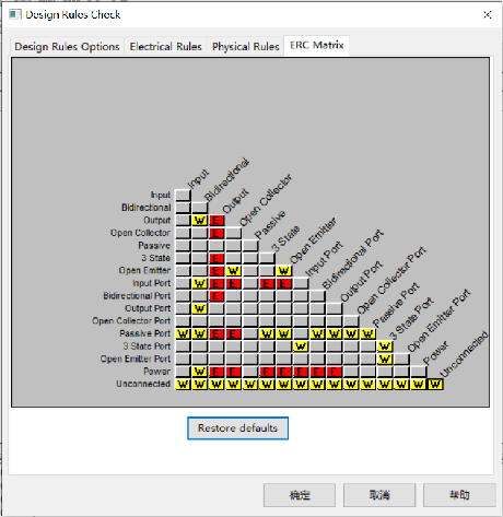 检查内容:检查未连接的器件管脚,根据ERC Matrix中的设置进行报错、警告或不提示。