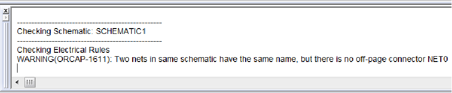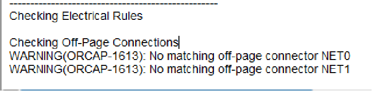 示例:off-page connector NET0和NET1分别在不同的页面出现一次,DRC检查报警告。