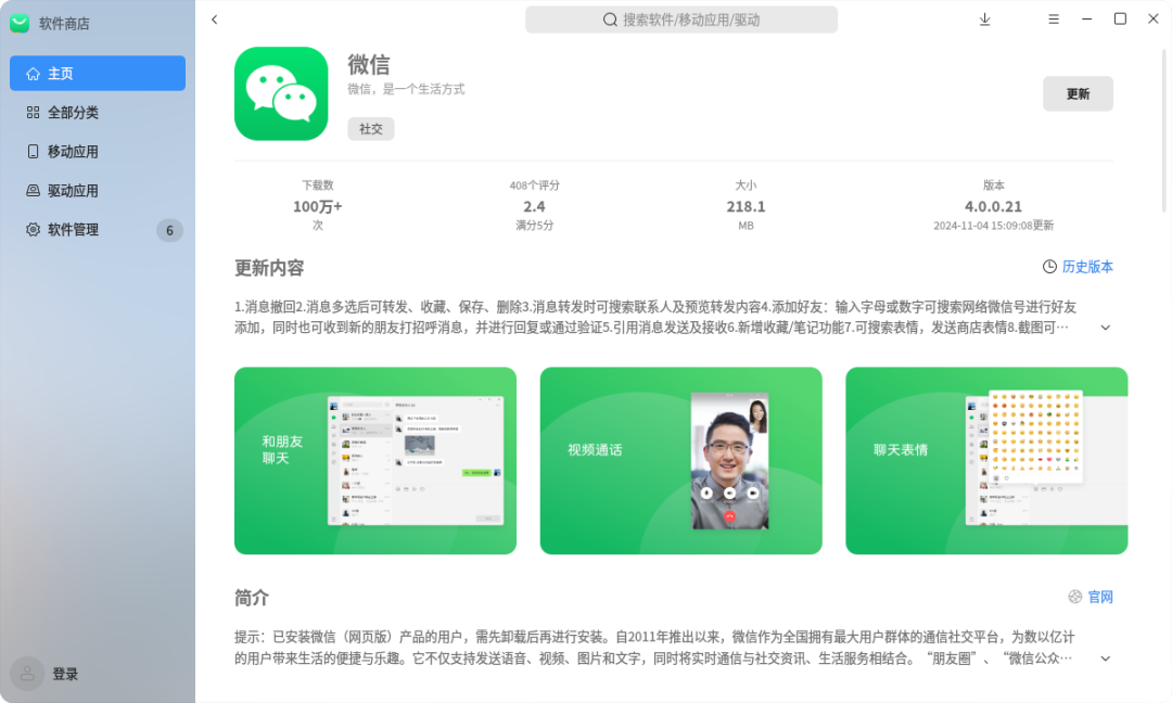 如果已安装《国产操作系统成功安装微信》中的WeChat -beta_1.0,那按照《Linux系统如何进行系统升级》更新一下系统就可以拥有微信4.0了。如果没有安装WeChat -beta_1.0,那先要更新系统才能在软件商店看到微信4.0。