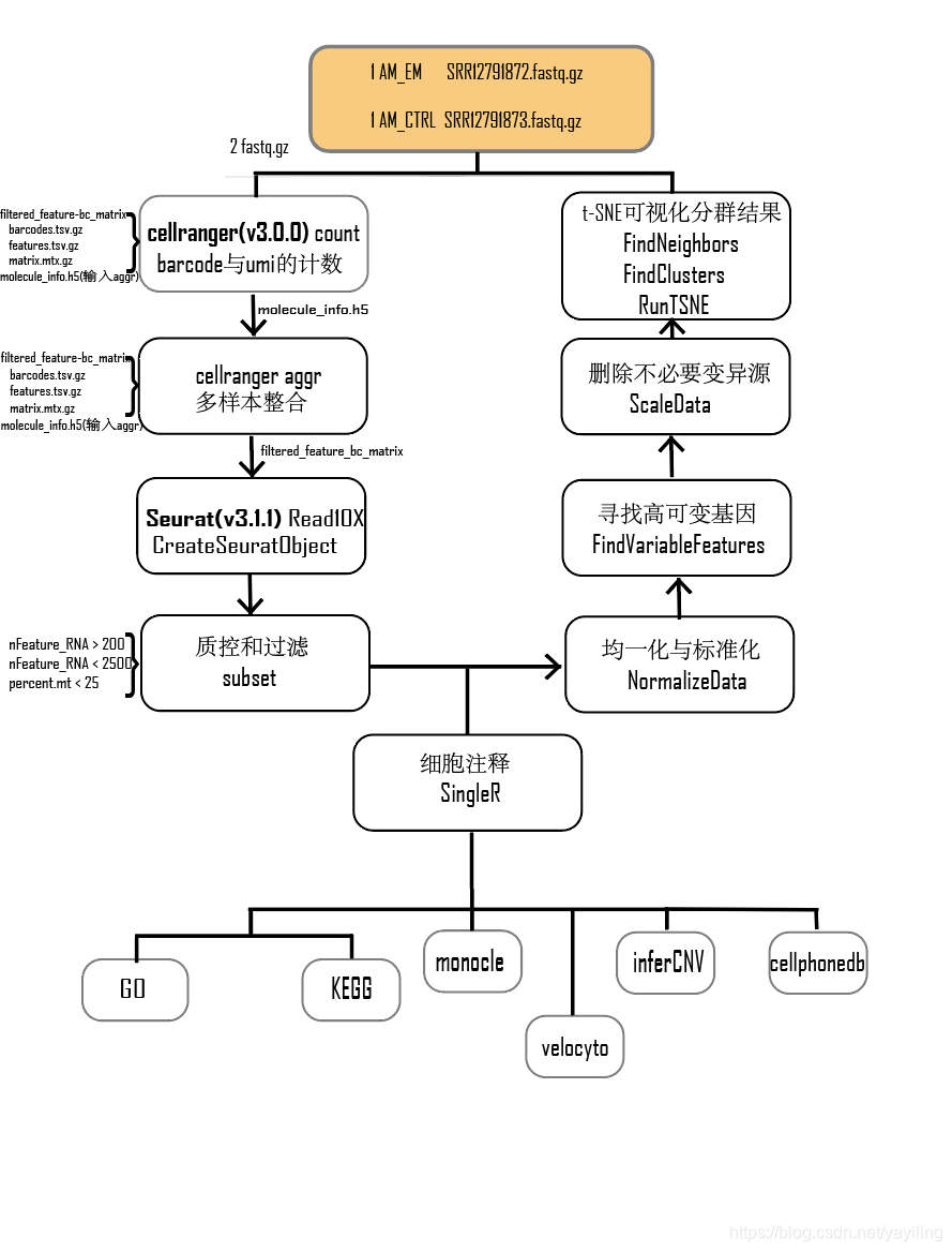 用cellranger aggr合并三个样本,但由于占用学校服务器内存太多,所以**只使用一个病例组(AM_EM)和一个对照组(AM_CTRL)**进行下面的分析。