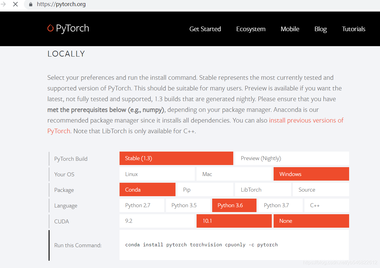 进入Pytorch的官网,根据自己的电脑环境配置选择,即可得到相关的安装的命令,之后在Anaconda Prompt中输入命令即可完成Pytorch的安装(cuda是有GPU的时候选择,使用CPU的话选择None即可)。