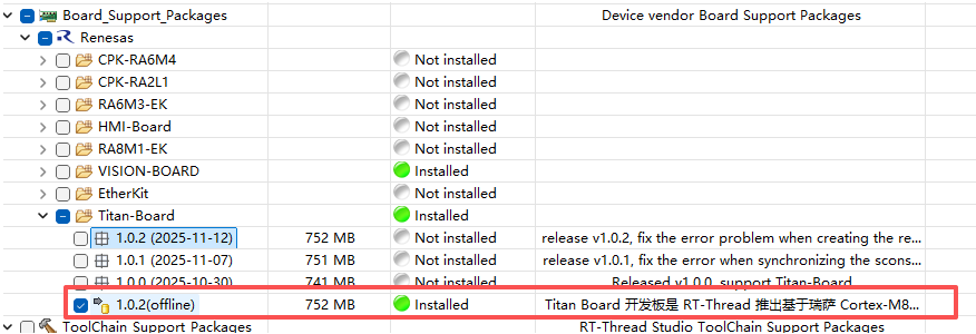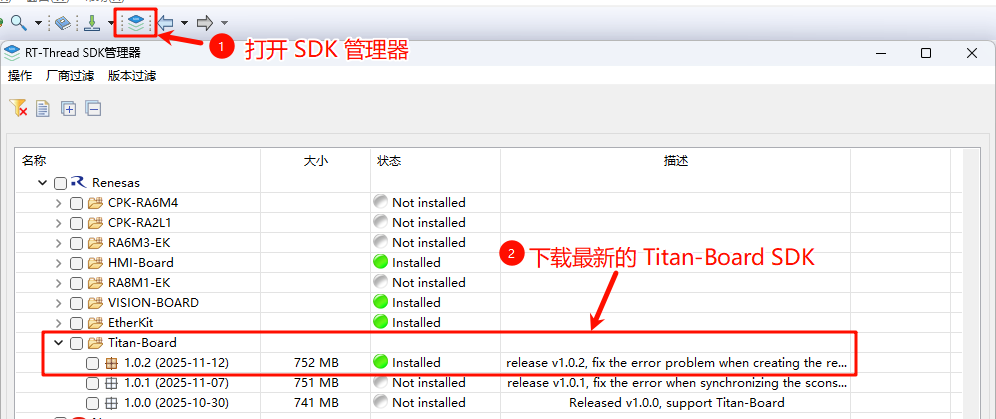 在 RT-Thread Studio 中下载 Titan-Board SDK 及相关依赖(下载Titan-Board SDK 时,其他依赖会自动下载)。