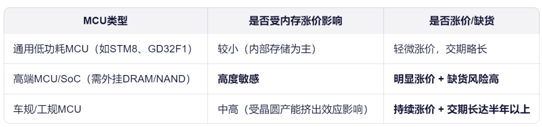 高端/应用型MCU 或 SoC类MCU(如带AI加速、图形处理、运行Linux的芯片),可能需要外挂DDR/LPDDR(DRAM)或eMMC/NAND,这类产品会直接受到内存涨价影响。