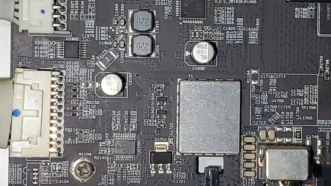 金属罩下是主 SoC(电视主芯片)和内存、闪存。