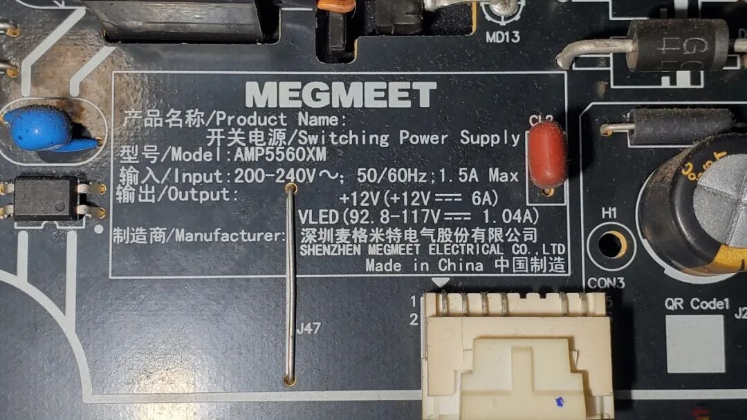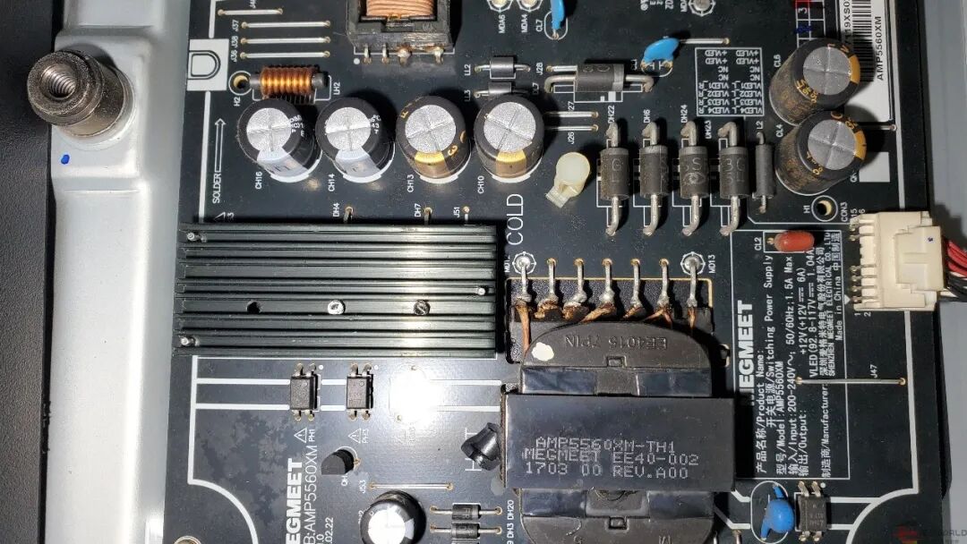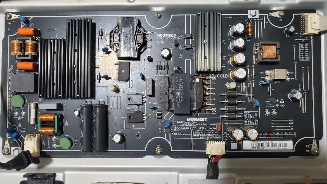 先来看主板,小米电视 3S 60 英寸(Mi TV 3S 60")的电源板,由 MEGMEET(美的旗下子公司,专业代工电源板) 生产,型号为 AMP5560XM。下面是详细分析: