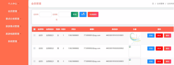管理员在会员页面查看会员号、会员姓名、性别、年龄、手机、邮箱、身份证、头像,进行查看、删除、修改等操作。程序效果图如下图5-3所示: