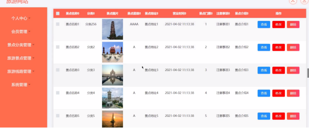 管理员对旅游景点进行查看景点名称、分类、景点图片、景点星级、景点地址、营业时间、景点门票、注意事项、景点介绍,并进行查看、修改以及删除等操作。程序效果图如下图5-4所示: