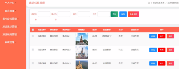 管理员对旅游线路管理进行查看线路名称、景点名称、景点地址、线路图片、起点、途径路径、终点、交通方式,进行c'k、删除、修改以及可进行查询线路名称、景点名称、起点、终点进行查询操作。程序效果图如下图5-5所示: