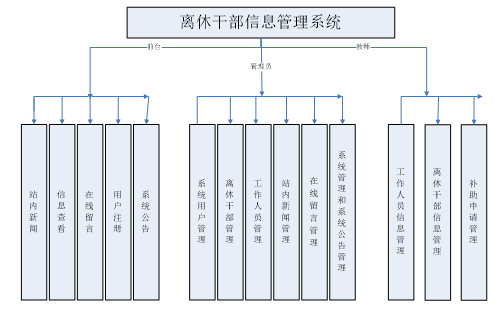 本系统主要是以离退休人员管理工作为背景,在使用方面,操作简单的前提下进行开发和研究,并且进行了一系列的设计和整合。本离休干部信息管理系统,主要分为两方面的工作,第一个是对于基本信息的统计和管理,对于离休干部的基本信息的管理,也对于离休干部的相关的困难补助的申请有着一个重要的管理和审批审核的工作,系统的主要功能如下所示:
