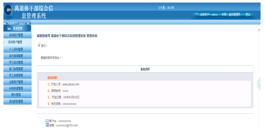 (2) 管理员用户具有系统信息管理、工作人员信息管理,离休干部注册审核管理以及相关的系统公告,留言板等基本信息的管理,管理员还可以对系统的离休干部相关的补助申请进行相关的查看,资料的下载,以便对离休干部相应的信息进行审核管理。