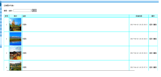 后台的图片管理,主要是为了丰富网站的前台的首页饱和程度,让首页显得更加饱和,美观,所以采用了图片的展示,可以展示企业的文化活动信息,也可以展示一些自然风光等,图片信息管理如下所示: