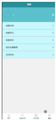 用户,在我的页面可以对个人中心、核酸检测、核酸预约、核酸报告、我的收藏管理、在线咨询等详细信息进行操作,如图5-6所示。