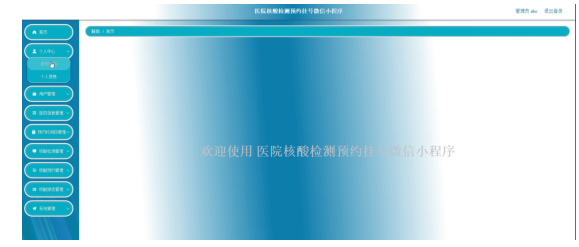 本系统主要包括管理员和用户;主要包括:首页、个人中心、用户管理、医院信息管理、预约时间段管理、核酸检测管理、核酸预约管理、核酸报告管理、系统管理等功能的管理系统。