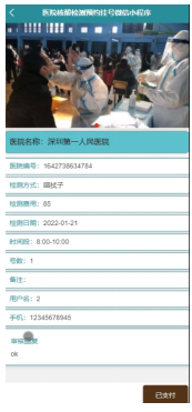 核酸预约,在核酸预约页面可以查看医院编号、医院名称、检测方式、封面、检测费用、检测日期、时间段、号数、备注、用户名、手机、审核回复等信息,并进行已支付操作,如图5-7所示。