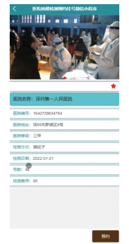 核酸检测,在核酸检测页面可以查看医院编号、医院名称、医院地址、医院等级、封面、检测方式、检测日期、号数、检测费用等信息,根据需要进行预约操作,如图5-4所示。