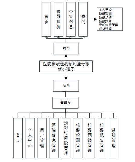 为了更好的去理清本系统整体思路,对该系统以结构图的形式表达出来,设计实现该医院核酸检测预约挂号微信小程序的功能结构图如下所示: