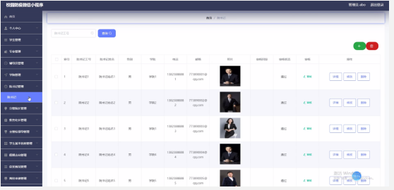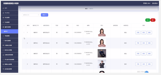 辅导员管理,通过查看辅导员工号、辅导员姓名、性别、学院、电话、邮箱、照片、审核回复、审核状态等信息进行详情、修改、删除操作,如图5-19所示。