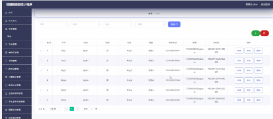 校园防疫微信小程序在系统的手机上可以运行,主要实现了管理员后端;首页、个人中心、学生管理、专业管理、辅导员管理、学院管理、院书记管理、分管院长管理、教务处长管理、主管校领导管理、学生基本信息管理、假期去向管理、获奖情况管理、离校申请管理、请假申请管理、公告栏管理、院部离校申请管理、系统管理,学生前端;首页、公告栏、我的,辅导员前端;首页、公告栏、我的,院书记前端;首页、公告栏、我的,分管院长前端;首页、公告栏、我的,教务处长前端;首页、公告栏、我的,主管校领导前端;首页、公告栏、我的等主要功能模块的操作和管理。