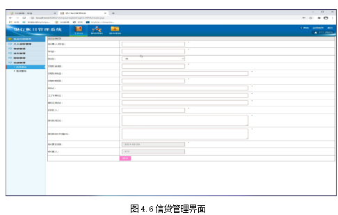 当员工选择了信贷管理界面,需要填写的内容较多。需要填写详细的借款用户的信息内容,以及贷款的用途、借款的期限、工作单位等内容。这些内容的记录,方便信贷人员对贷后进行详细的排查和管理。如图4.6所示: