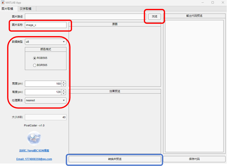 首先安装(在MATLAB中)并打开取模软件(基于MATLAB环境开发,如果先前没有安装MATLAB可能需要额外占用一定空间),在“图片取模”中点击“浏览”导入需要显示的图片,并按自己的需要来进行各参数的设置,之后点击“转换并预览”查看结果。