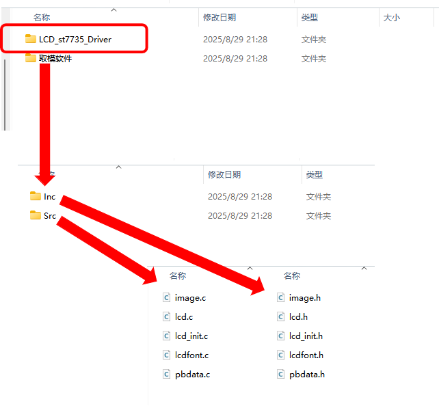 下载压缩包并解压后,打开“LCD_st7735_Driver”文件夹,可以看到其中包含“Inc”和“Src”两个文件夹,分别存有.h头文件和.c源文件。