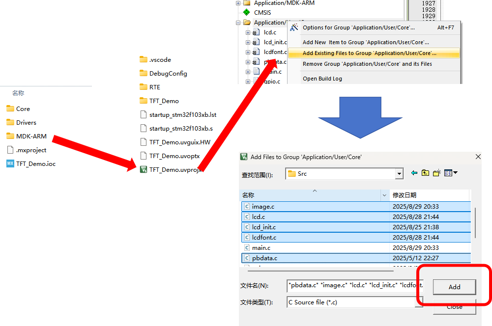 回到第一级文件夹,打开“MDK-ARM”文件夹继续打开Keil工程文件。进入工程后,在界面左侧“Application/User/Core”文件夹处右键选择“Add Existing Files to...”,找到刚才的Src文件夹(在由CubeMX导出的Core文件夹内,不是本项目下载和解压的文件夹),将粘贴好的五个.c文件一并导入(按住Ctrl逐个选中后点击“Add”)。