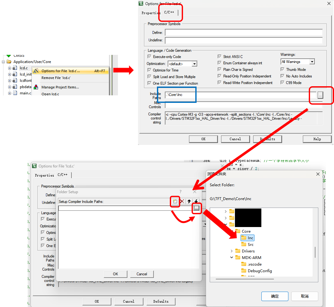 或手动点击选择相应的路径(点击3个点-New(Insert)-3个点-选择Core文件夹内的Inc文件夹)。最后点击OK。注意要为每一个新导入的.c文件都进行该操作。