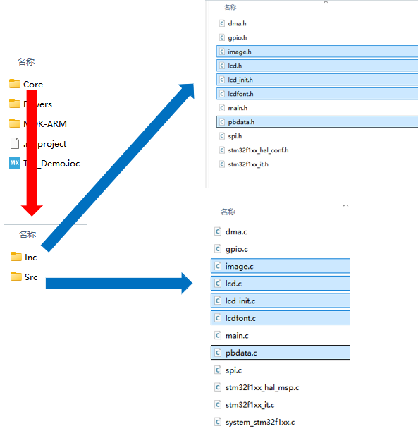 打开由CubeMX导出的开发工程,找到并打开其中的“Core”文件夹,可以看到其中也有“Inc”和“Src”文件夹。将之前“LCD_st7735_Driver”文件夹下Inc中的.h文件复制到这里的Inc中,Src中的.c文件复制到这里的Src中。