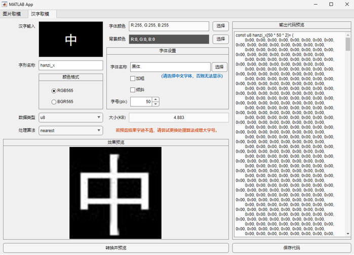 - 配套开发了基于MATLAB的图片取模和汉字取模软件;