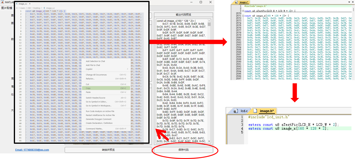 确认无误后,点击“保存代码”,可以将生成的图片代码保存为.c文件,再用任意的IDE(如VS Code甚至记事本)打开后全部复制到image.c文件中,同时在image.h中加入extern声明即可,例如: