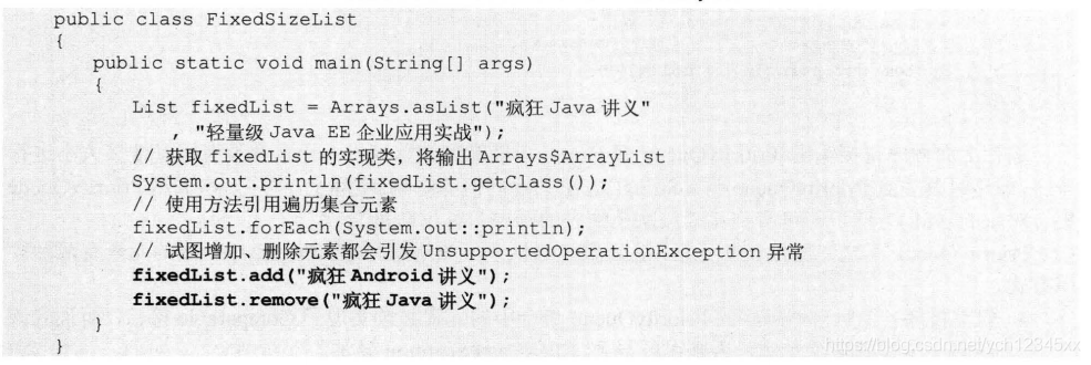 17)Arrays工具类提供了asList(Object o)方法,该方法可以把一个数组或指定个数的对象转换成一个List集合,这个List集合既不是ArrayList实现类的实例,也不是Vector实现类的实例,而是Arrays的内部类ArrayList的实例。Arrays.ArrayList是一个固定长度的List集合,程序只能遍历访问该集合里的元素,不可增加,删除该集合里的元素。如下所示: