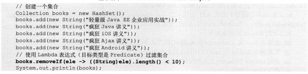 7)Java8起为Collection集合新增了一个removeIf(Predicate filter)方法,该方法会批量删除符合filter条件的所有元素。该方法需要一个Predicate对象作为参数,Predicate是函数式接口,因此可使用Lambda表达式。