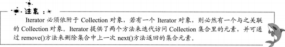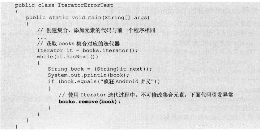 4)Iterator迭代访问Collection集合元素时,Collection集合里的元素不能被改变,只有通过Iterator的remove()方法删除上一次next()方法返回的元素才可以;否则会引发java.util.ConcurrentModificationException异常。下面程序示范了这一点: