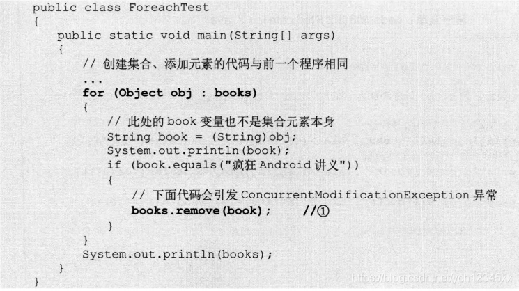 foreach循环中的迭代变量也不是集合元素本身,系统只是把集合元素的值赋给了迭代变量,因此在foreach循环中修改迭代变量的值也没有任何实际意义。同样,当使用foreach循环迭代访问集合元素时。该集合也不能被改变。如下