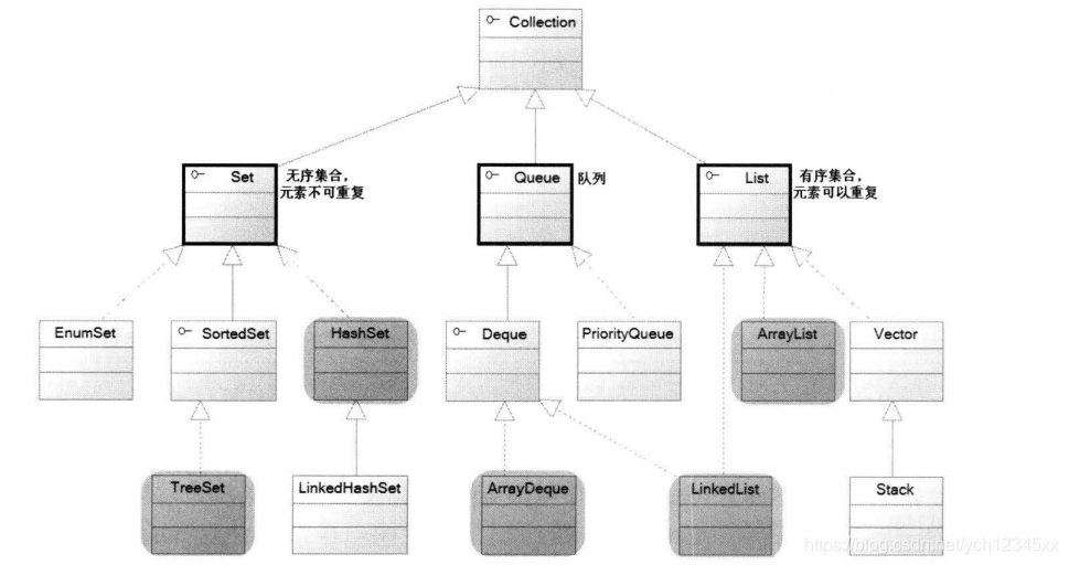 其中粗线圈出的Set和List接口是Collection派生出的子接口,它们分别代表无序集合和有序集合;Queue是java提供的队列实现。
