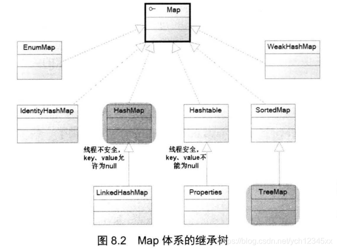 2)Map接口的众多实现类,这些实现类在功能,用法上存在一些差异,但它们都有一个功能特征:Map保存的每项数据都是key-value对。Map中的key是不可重复的,key用于标识集合里的每项元素,如果需要查阅Map中的数据,总是通过key值。