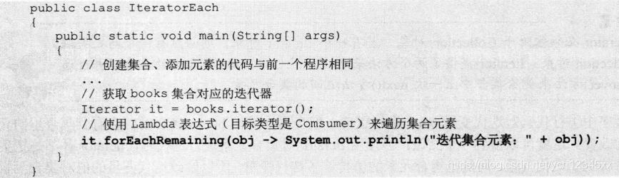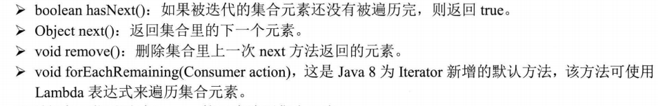 java8起为Iterator新增了一个forEachRemaining(Consumer action)方法,该方法所需的Conumer是一个函数式接口。当程序调用Iterator的forEachRemaining(Consumer action)遍历集合元素时,程序会依次将集合元素传给Consumer的accept(T t)方法。