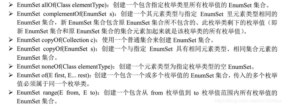 14)EnumSet是一个专门为枚举类设计的集合类,EnumSet的所有元素都必须是指定枚举类型的枚举值。EnumSet的元素是有序的,以枚举值在Enum类中定义顺序来决定集合元素的顺序。它有如下类方法来创建对象: