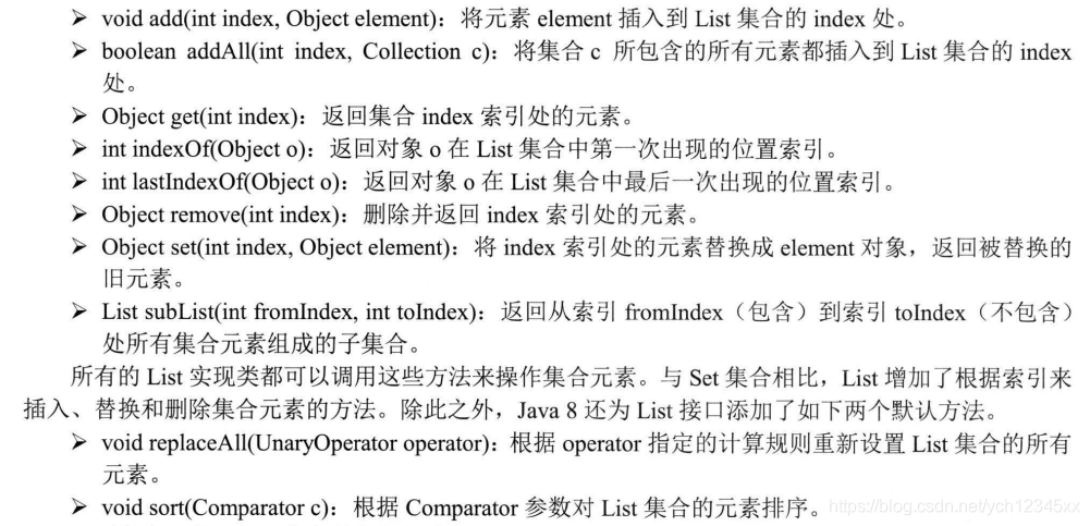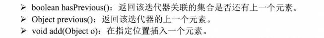 16)与Set只提供一个iterator方法不同,List还额外提供了一个listItarator()方法,该方法返回一个ListIterator对象,ListIterator接口继承了Iterator接口,提供了专门操作List的方法。ListIterator接口在Iterator接口基础上增加了如下方法: