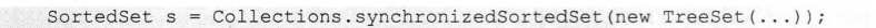 Set的三个实现类HashSet,TreeSet和EnumSet都是线程不安全的。如果有多个线程同时访问一个Set集合,并且有超过一个线程修改了该Set集合,则必须手动保证该Set集合的同步性。通常可以通过Collections工具类的synchronizedSortedSet方法来包装该Set集合。例如: