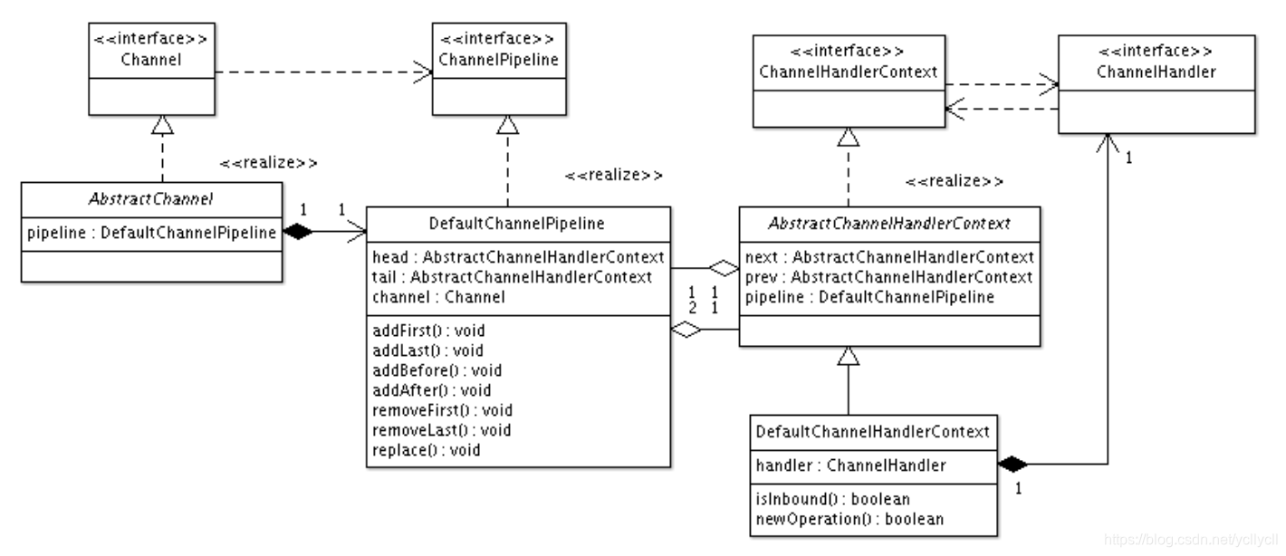 实心的菱形表示组合关系 -----如AbstractChannel包含DefaultChannelPipeline对象,但是DefaultChannelPipeline脱离了AbstractChannel不能单独存在(“部分”脱离了“整体”便不复存在)