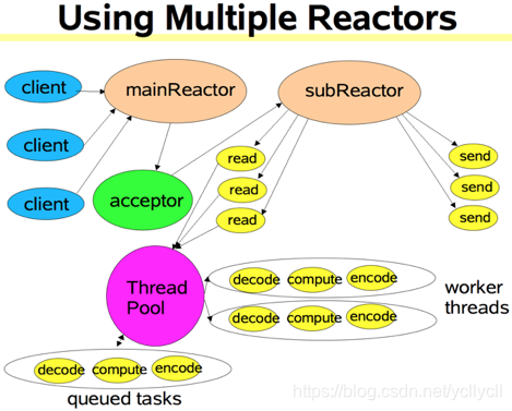 采用两个reactor,每个reactor都在自己单独的线程里执行。如果是多核,则可以同时响应多个客户端的请求,一旦链路建立成功就将链路注册到负责I/O读写的SubReactor线程池上。